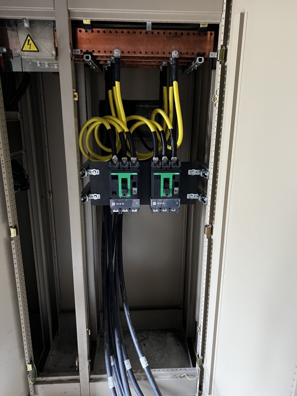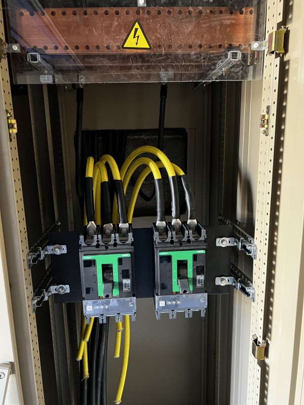 Nous avons installé deux disjoncteurs de 600A pour protéger cette installation.